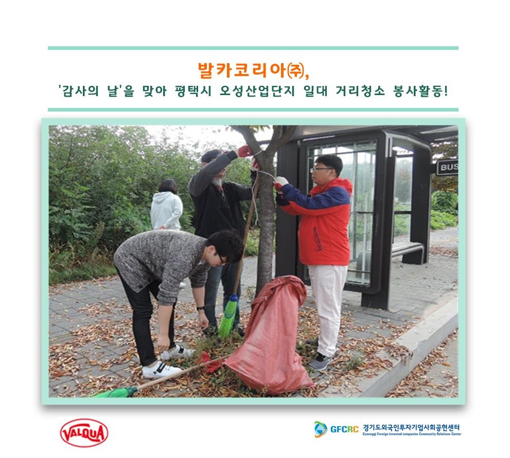 지난해 10월 ‘감사의 날’을 정해서 발카코리아(주) 임직원들은 직접 쓰레기봉투와 집게를 들고 나와 공장이 위치한 평택시 오성산업단지 주변의 거리, 공원 일대를 중심으로 쓰레기를 줍기에 나섰다.