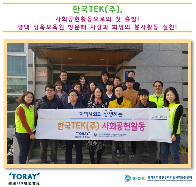 경기도외국인투자기업사회공헌센터(GFCRC)에서는 소외된 이웃 또는 사회적 약자를 위해 작은 것이라도 기여하고자 하는 한국TEK(주) 마음을 담아 도움의 손길이 필요한 봉사 수요처를 연계해 진행된 것으로, 사회공헌센터 임직원도 함께 참여해 첫 사회공헌활동에 힘을 실어주었다.